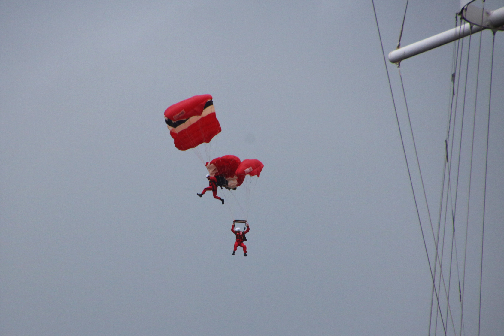 The parachutists landed in water and were plucked to safety.